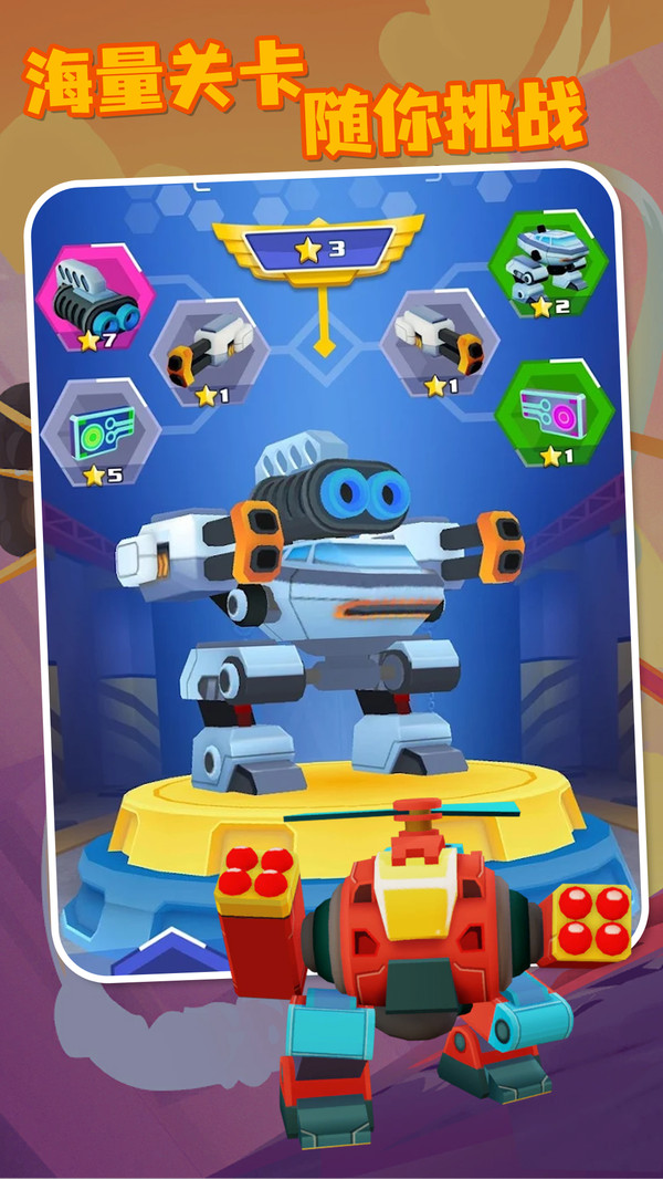 机甲战争是一款有着海量关卡的闯关类游戏,玩家在游戏中可以去获取各种类型的机器人,每一个机器人形象都是不一样的,无论是炫酷的还是一些丑萌的,都是可以在游戏中得到满足。而且每一个关卡中得到的奖励也是会在游戏中得到使用,帮助玩家变得更加的强大。