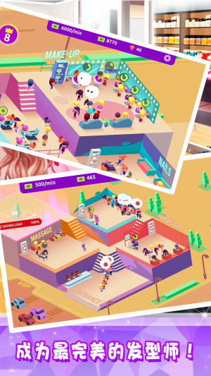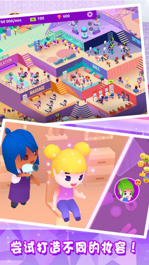 美容美发城市客厅是一款经营美容店的模拟类游戏,玩家的任务就是在游戏中让自己的声音蒸蒸日上,而且可以不断扩展许多不同的板块,成为一个美容界的大亨,每一次的顾客都是会为玩家带来一定的声望,当自己的能力达到一定的水准之后,就可以尝试扩张、招聘新的员工。