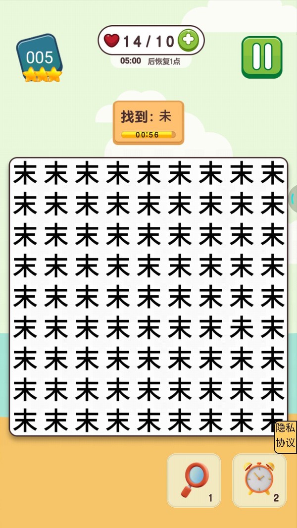 独特的游戏内容的设置,在这里可以尝试这些高难度的挑战体验了,玩家要眼疾手快的找出这个字,这里的寻找都是有一定的规律可以寻找的,找到这个规律这个游戏就简单了。