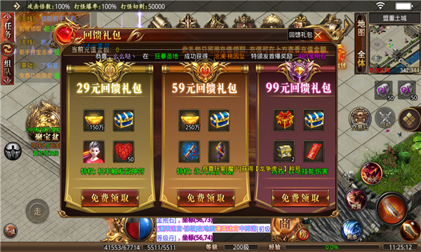 1、游戏中玩家上线就有满攻速,还能免费领取vip会员、自动回收、自动拾取等;