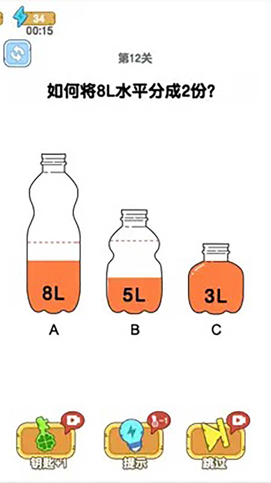 3、你的任务就是要把瓶子装满,但是很有难度,需要你不断的尝试才行。