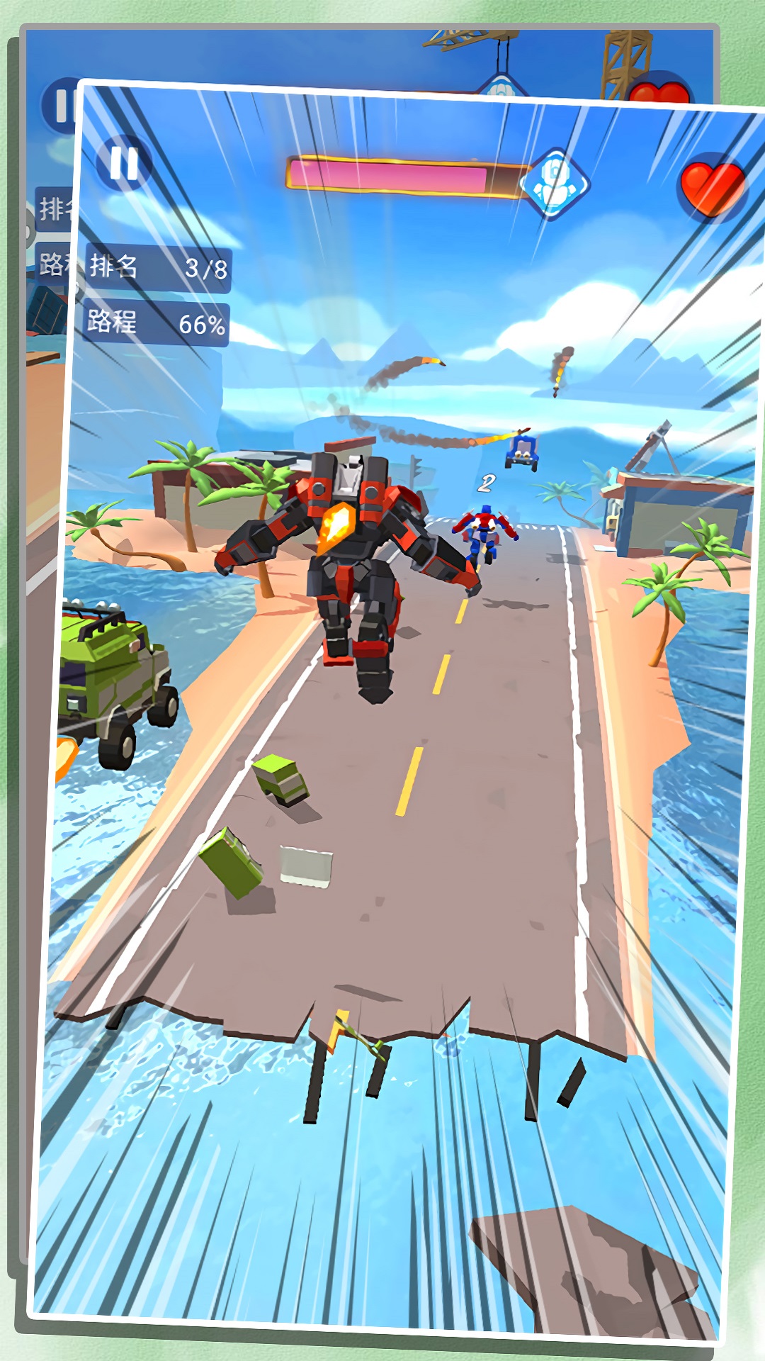 3、诸多场景,很多的障碍物和机关陷阱等,灵活避开,完成艰巨的赛车任务,体验刺激对决的快感。