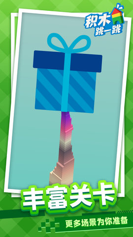 积木跳一跳游戏是一款休闲跳跃闯关游戏,精彩内容吸深深吸引着大众玩家,每一次的挑战都要认真专注,完成更多级别的任务,让你可以摘得丰厚礼包,每日玩法超级精彩,一直畅玩下去都十分过瘾啦,清新明了的卡通画风,整个视觉上的观感让人十分沉浸呢!
