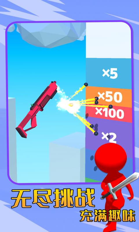 1、跑酷的主角是一只枪,我们可以在这里畅享精彩有趣的挑战,完成跟多的闯关任务;