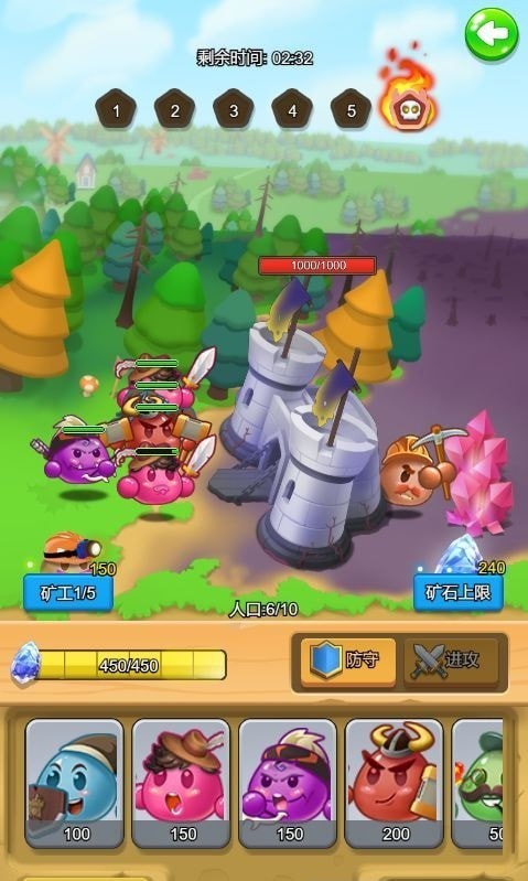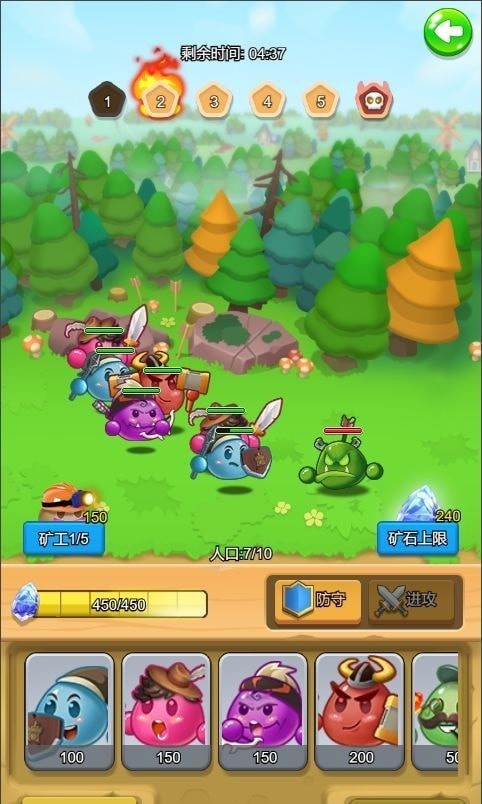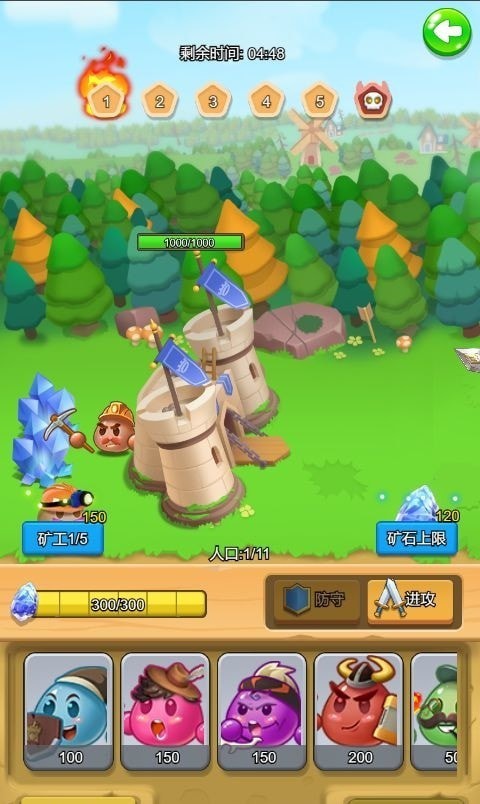 3、不断的挖掘砖石来升级团子们的战斗力,不断的变强来消灭所有敌人保护自己的家园。