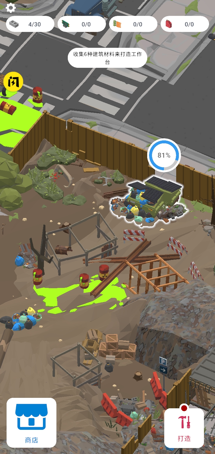 1、游戏通过点击操作,开始后点击垃圾堆,获得砖,建造床铺招募队友。
