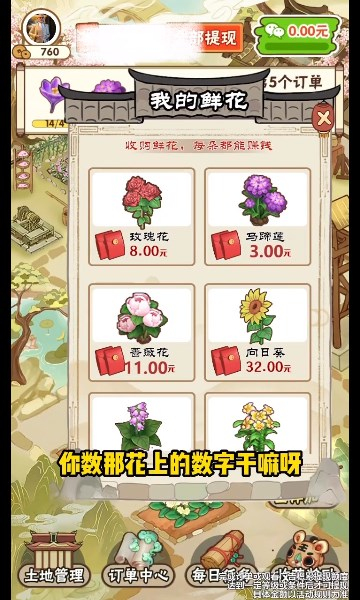 3、在这里畅享一场经营模拟的乐趣,种植满园的鲜花收获更加丰厚的红包,让种植经营更有趣。