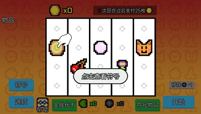 1.进入关卡进行收租挑战,在五回合内通过游戏机摇出不同的物品,获得相应的数量的金币。