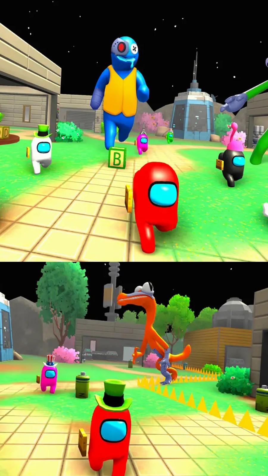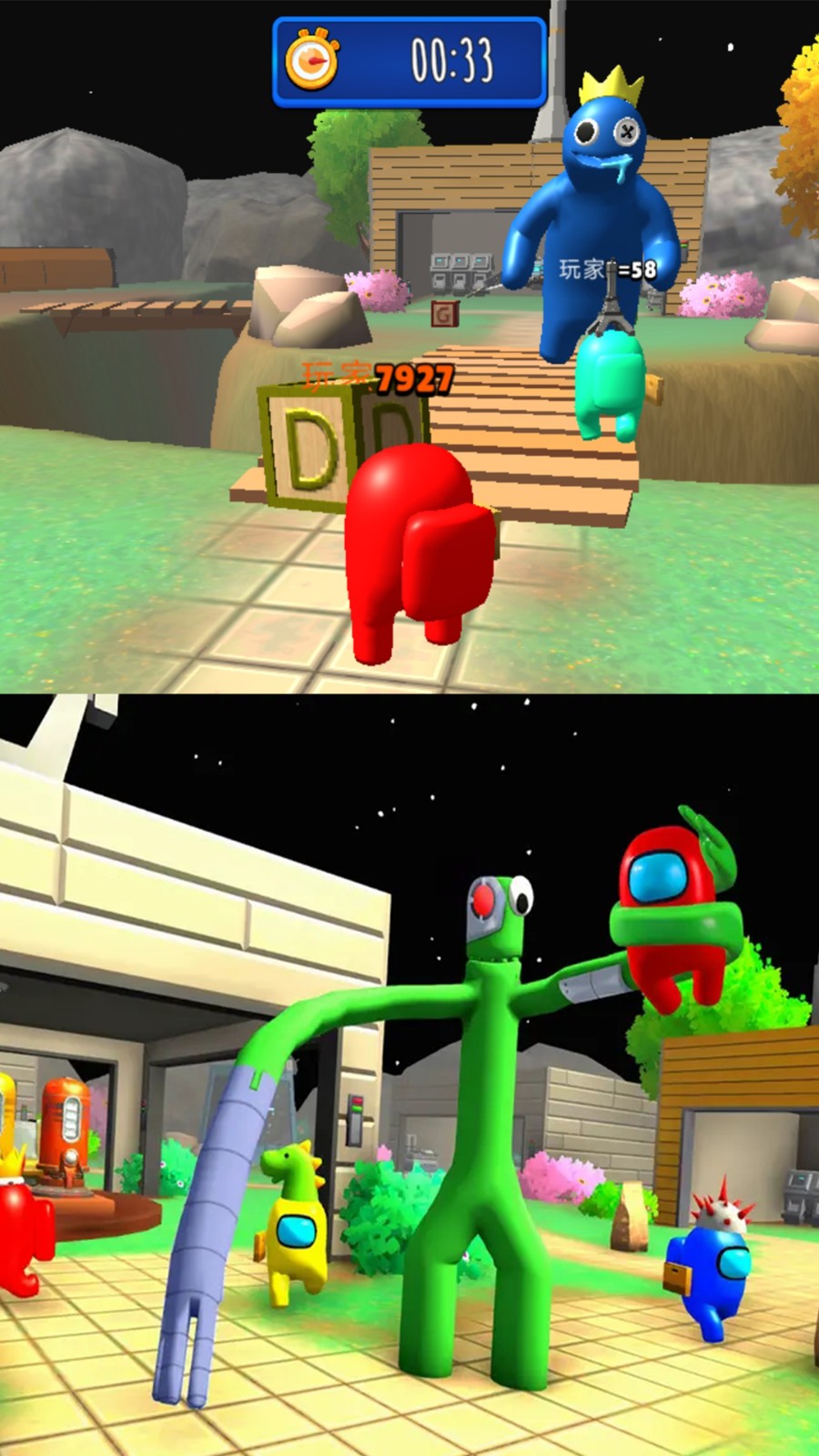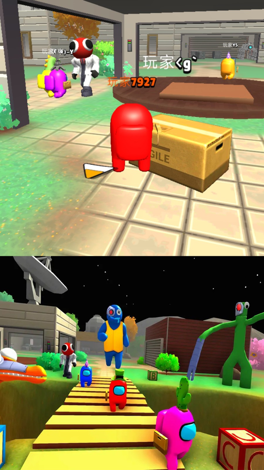 1.控制角色在场景中进行探索冒险,完成阵营任务,躲避随时会出现的彩虹朋友,赢得最终胜利。