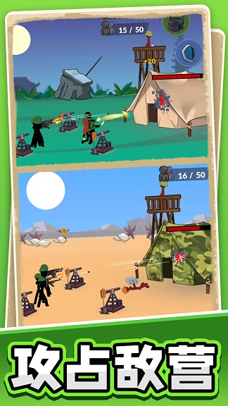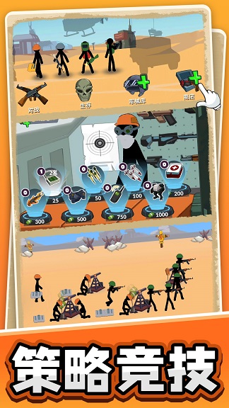 3、满足你的闯关爱好,更多类型的火柴人士兵等你去解锁,来进行合理的搭配。