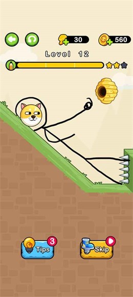 2.蜜蜂群喜欢在它们的头上刺狗蛋,玩家需要动动脑筋,画出一条线,让狗挡住他们。