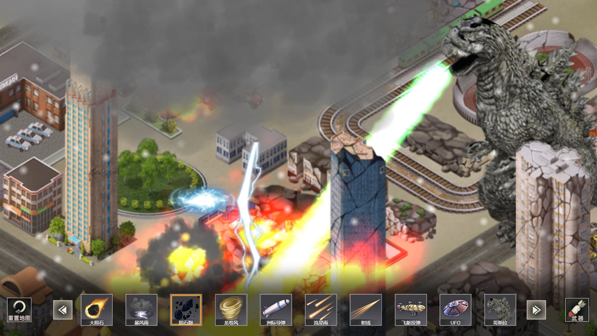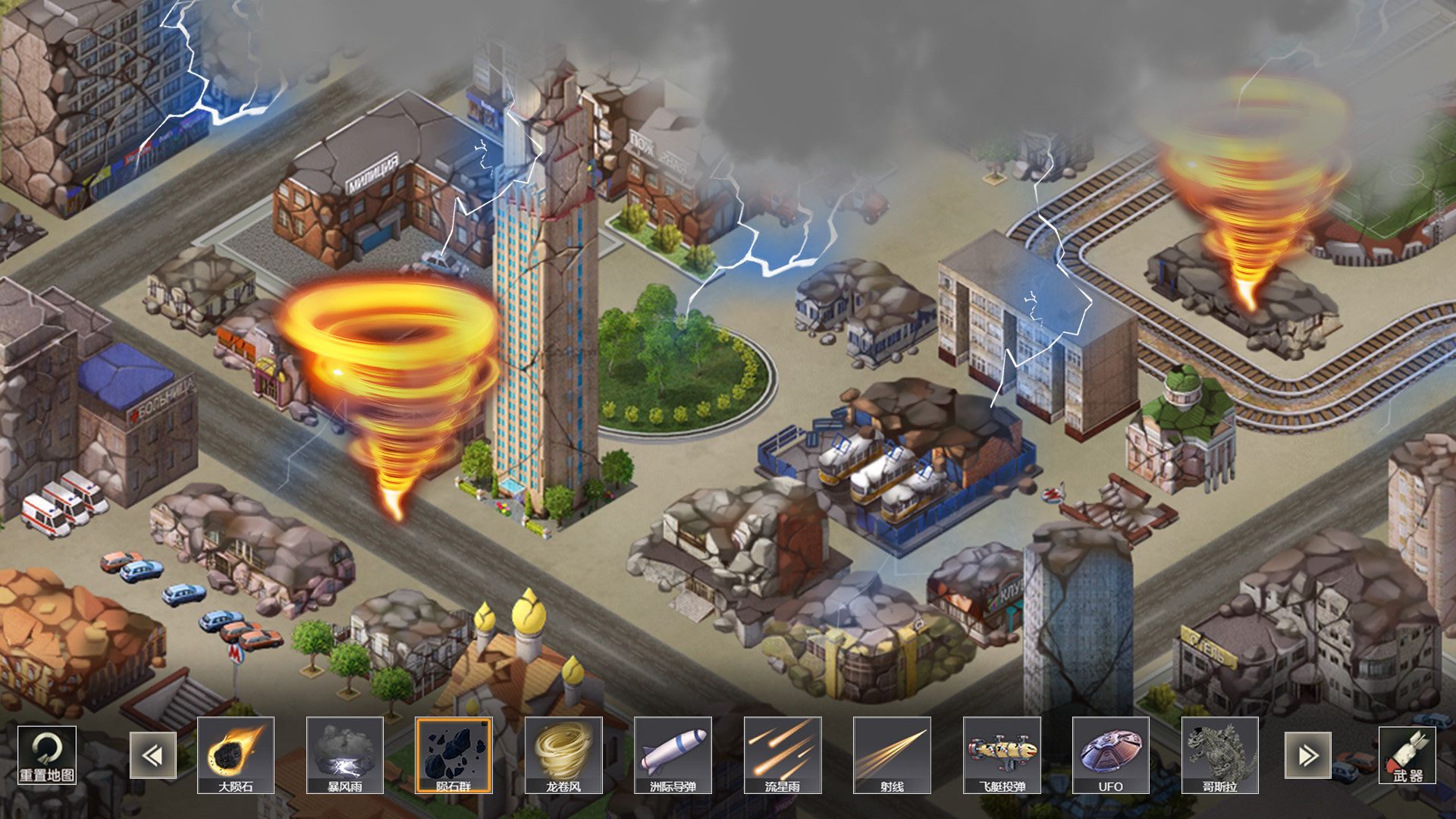 2、投放大量的武器进行破坏,还能召唤各种极端天气来摧毁城市,体验更多解压玩法。