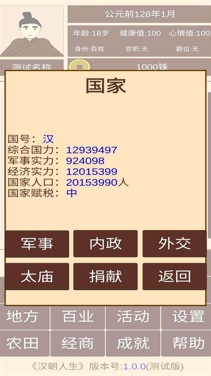 汉朝人生游戏是回到了特定的西汉时期来重过你的一生,可以参与匈奴之战封狼居胥,可以趁着文景之治的美好时代来积累财富,以汉朝为背景,体验皇帝的一生,开创治世,看看游戏中能否获得更大的成就。