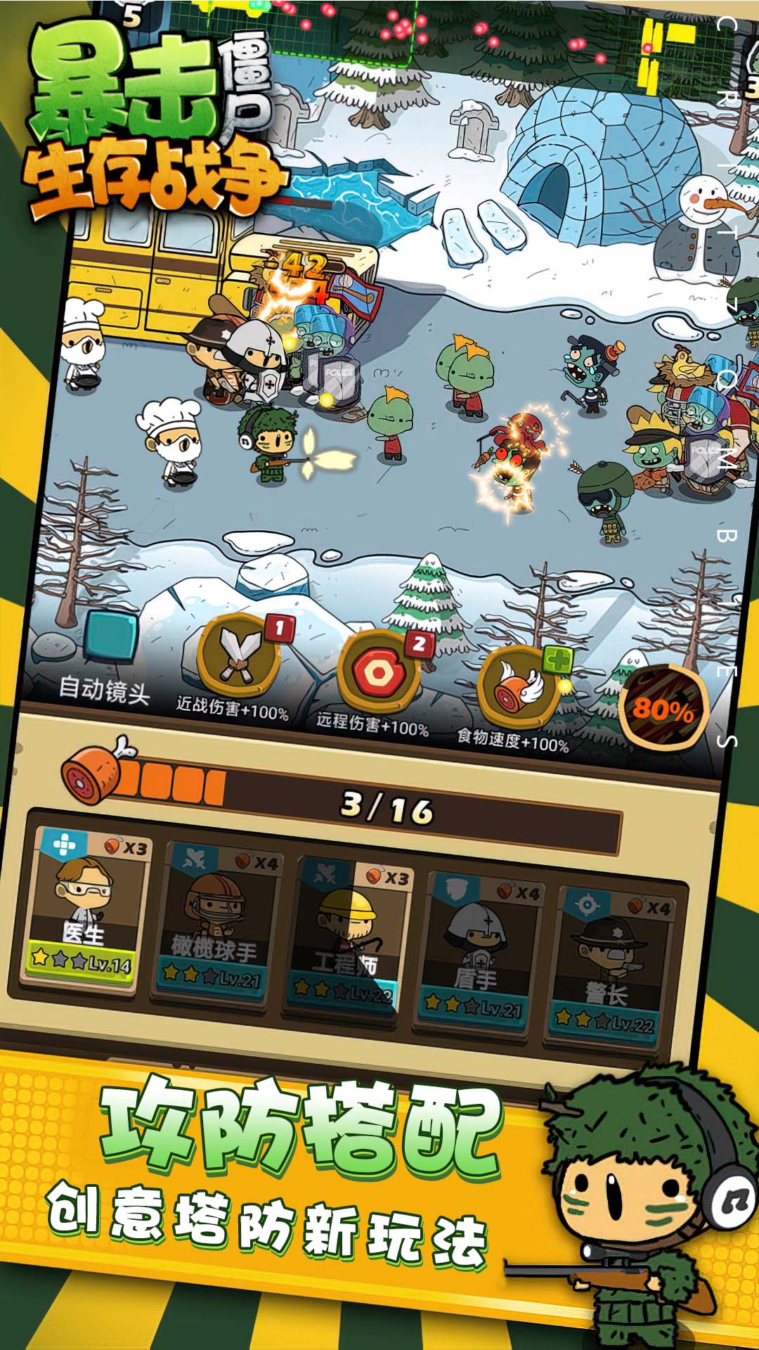 2、海量炮台,丰富多样,通过不断的合并来升级武器,让玩家轻松的抵抗僵尸大军的入侵;
