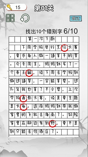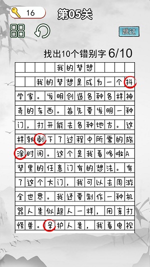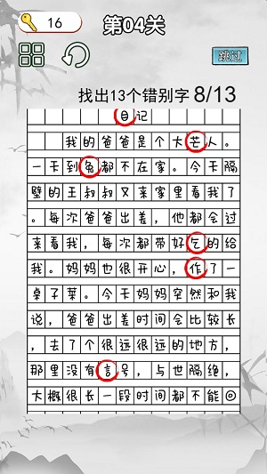 3、闯关的过程就是在这里面的关卡过程中找到所有的错别字。