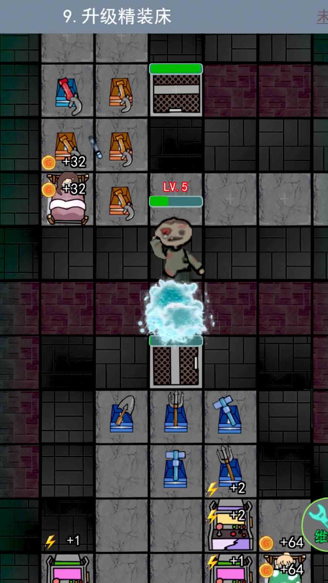 2、倒计时之前进入宿舍躺平赚金币,安置炮台来抵御猎梦者;
