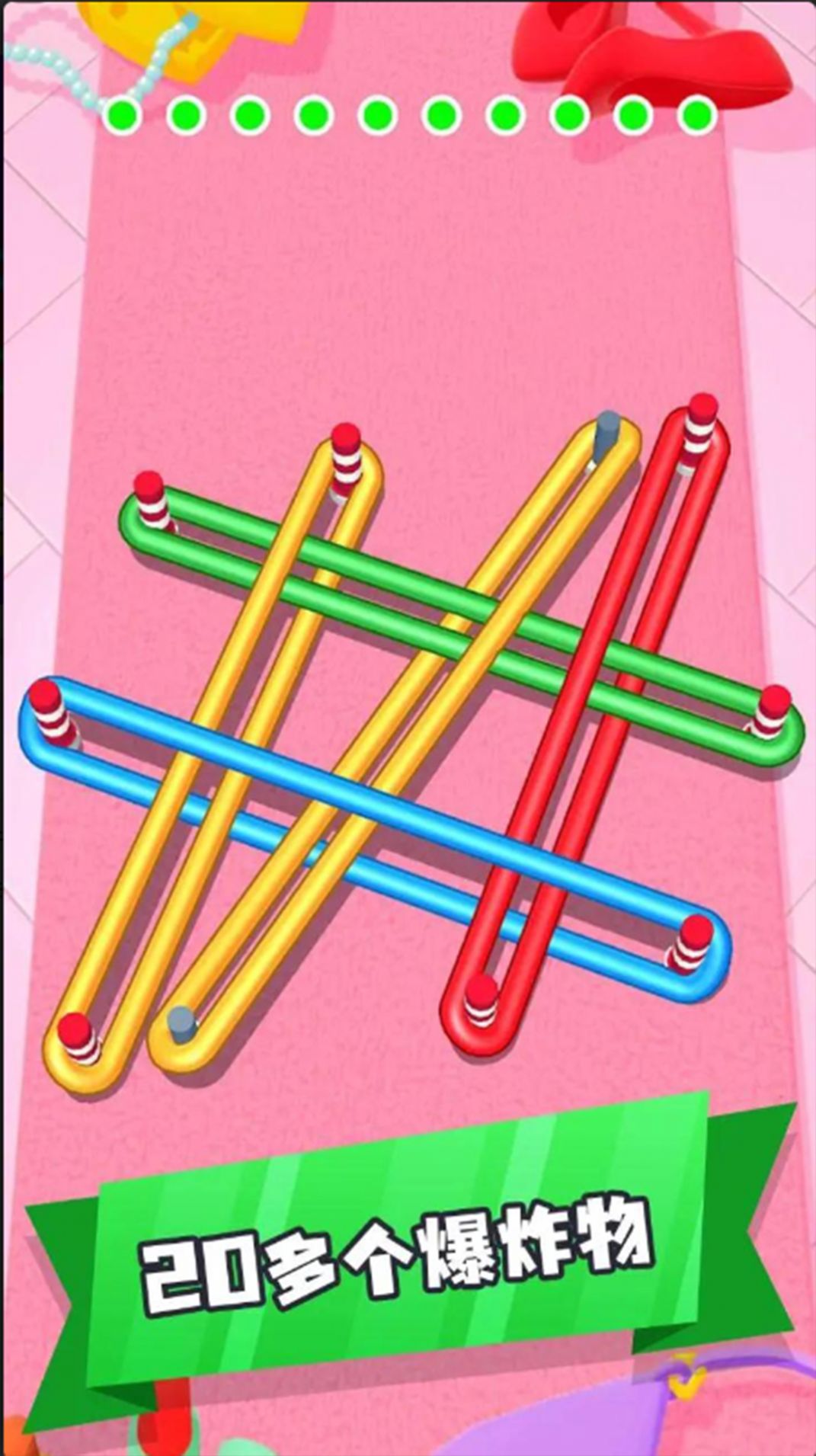 1、将不同颜色的橡皮筋按照不同的顺序将其全部解开,有众多关卡需要解决橡皮筋的问题。