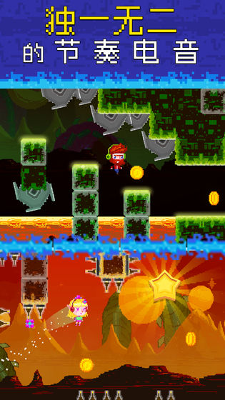 节奏冲刺是一款非常有意思的冒险闯关类游戏,这里面可以给玩家带来一个十分魔性的像素世界,里面各种背景音乐都是无比的动听,可以给玩家带来十分的强烈的节奏和律动感,大量的人物都是去进行收集的,然后来快速的进行闯关,里面的各种关卡的设计也是无比的巧妙,还有很多的搞笑剧情可以去进行观摩,大量的金币可以去进行收集,里面的各种道具都是无比的丰富。