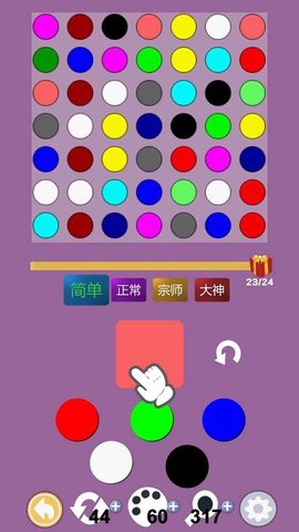 3、使用三原色+黑白色,组合成不同的颜色,若小球与配出来的颜色相同,则会被消除,所有小球被消除后过关。