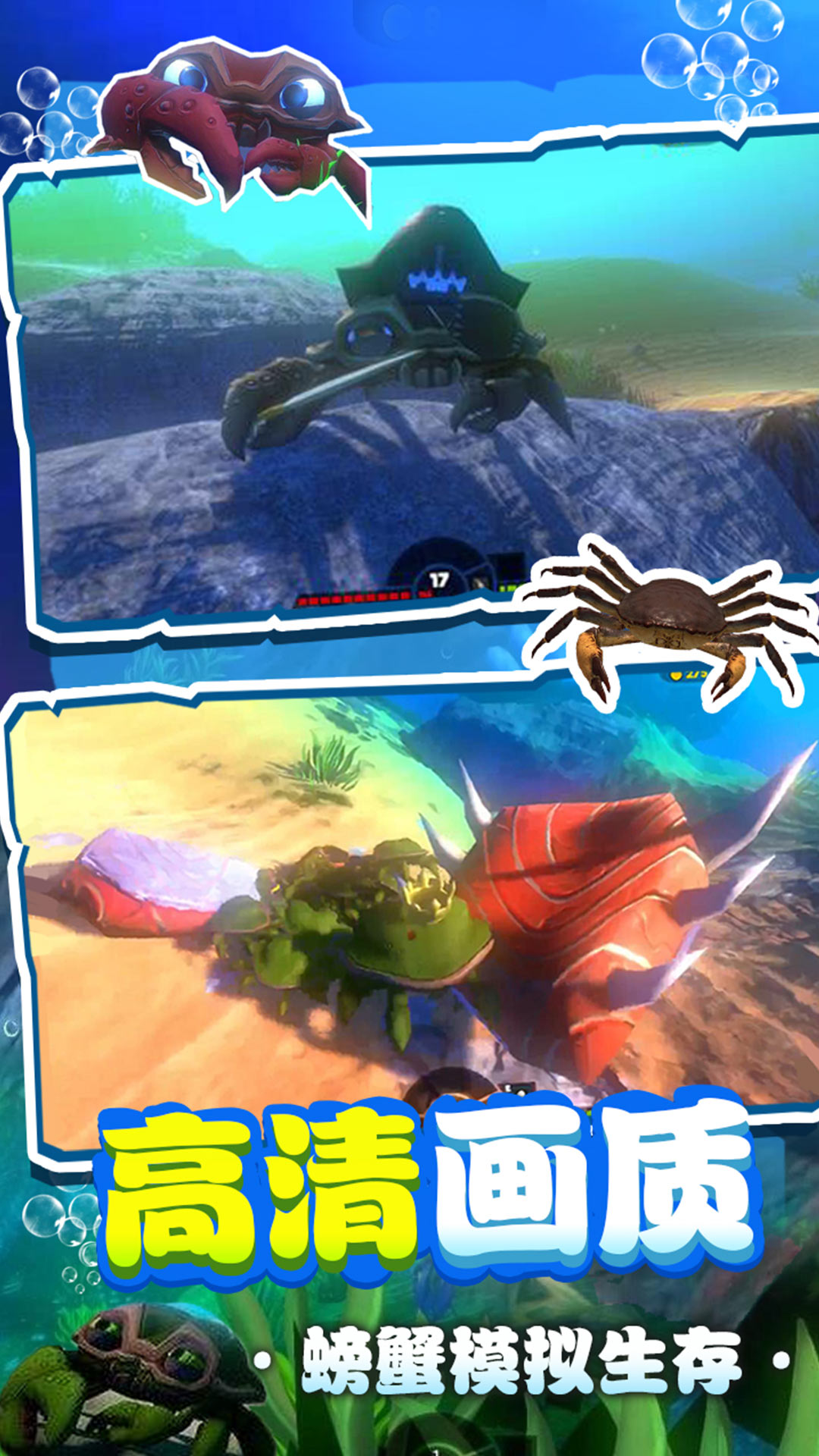 2、拼命游动,感受螃蟹的威力,让你指挥海底世界的螃蟹对战,完成霸业壮举。