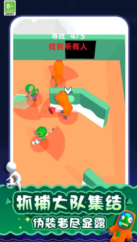 1、各种不同颜色的卡通小人,自由挑选,开启经典躲猫猫挑战;