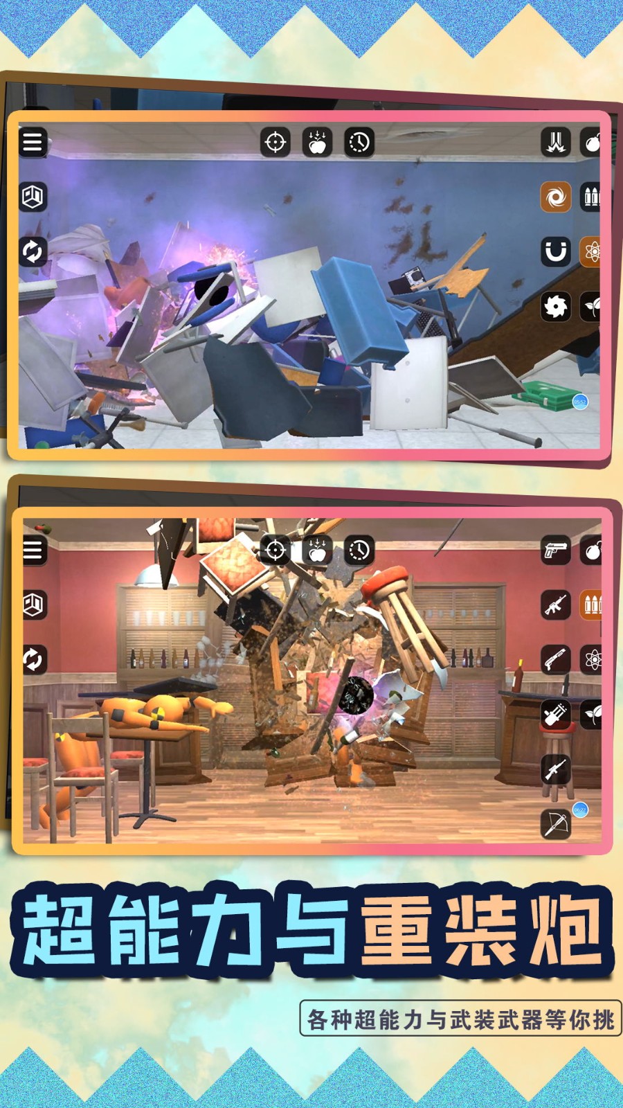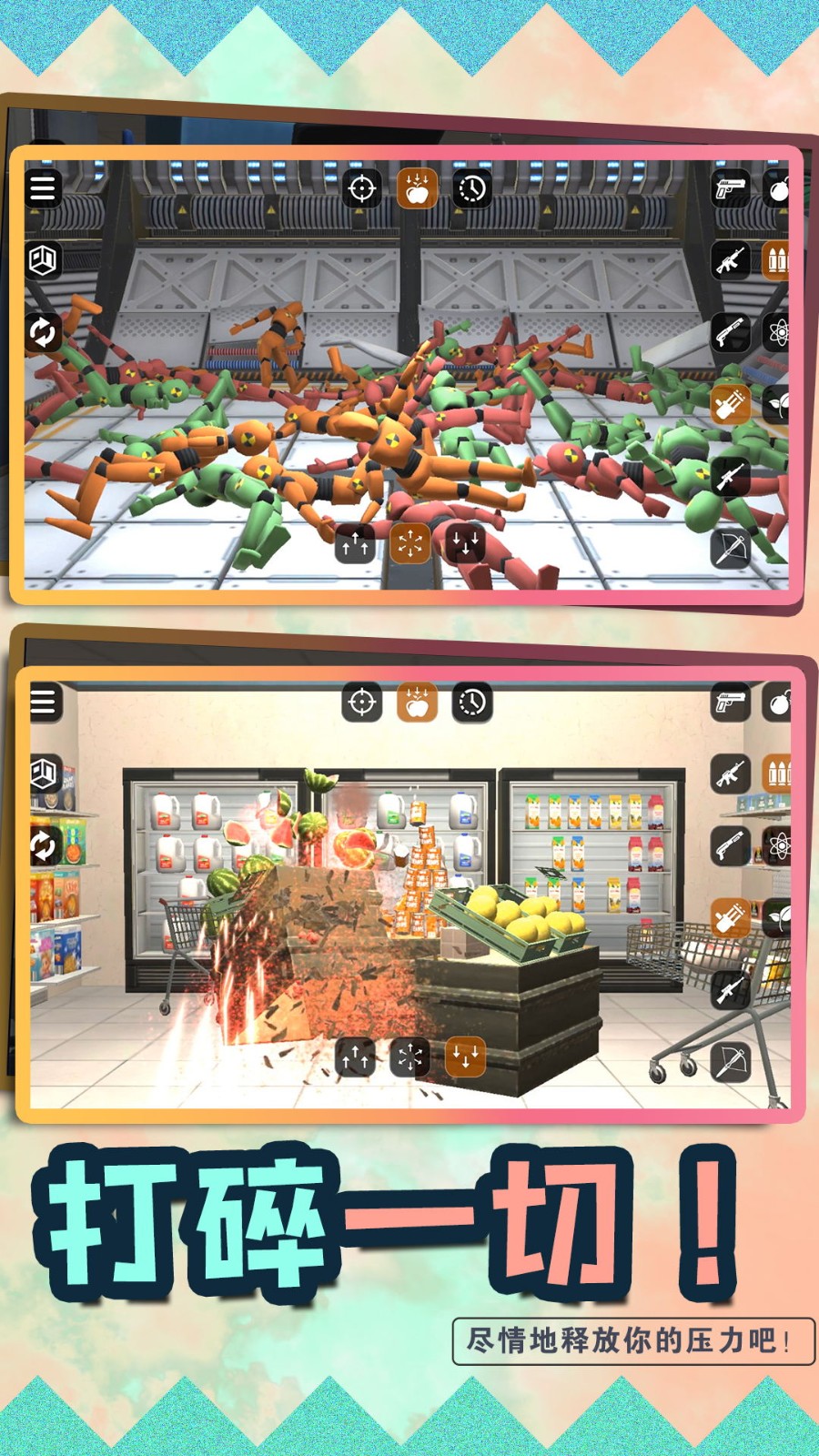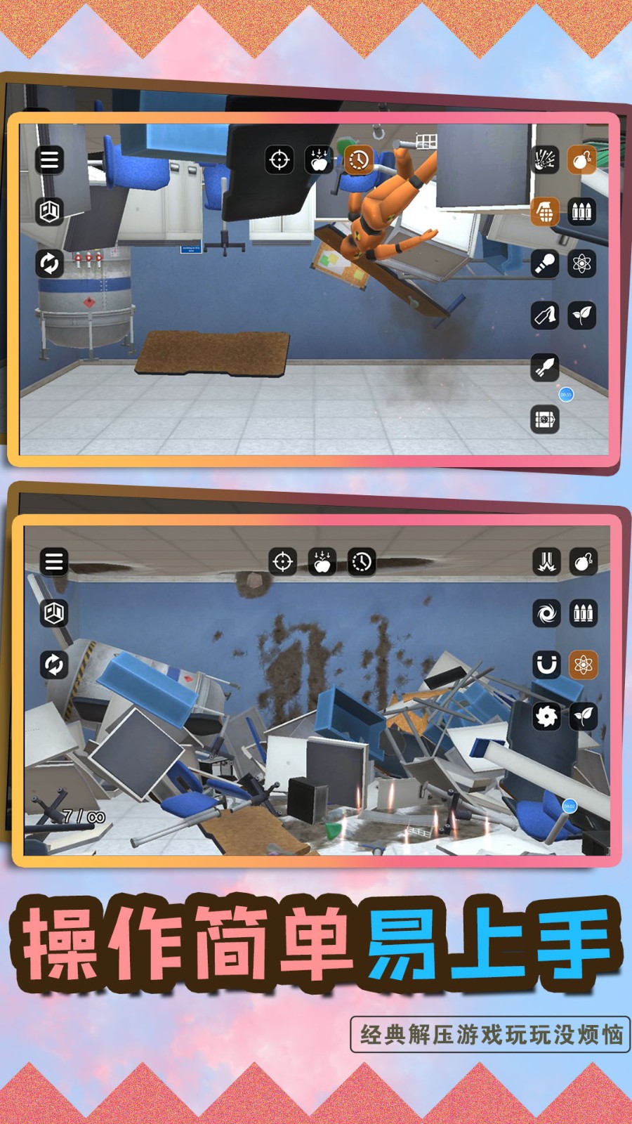 3.不需要动脑子的游戏,操作很简单,只需要毫无顾忌的解压,搞破坏吧。