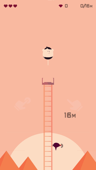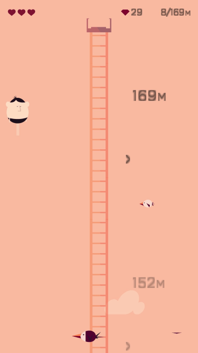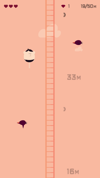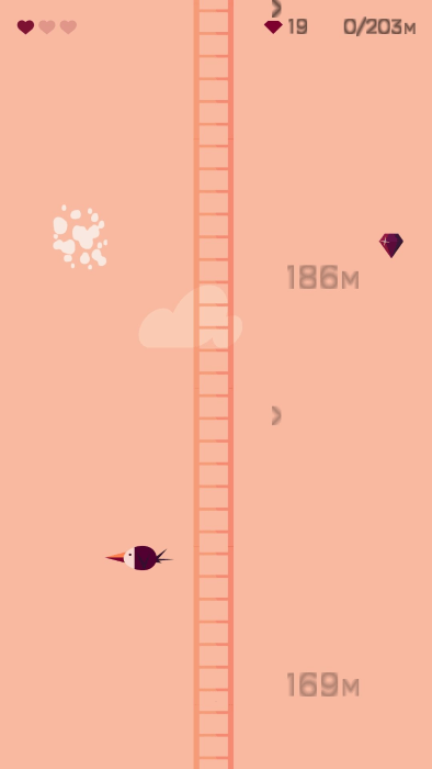 2、当你在高空中被小鸟攻击到时会损失一格心,并继续向上,当三格心全部消耗完毕就会失败;