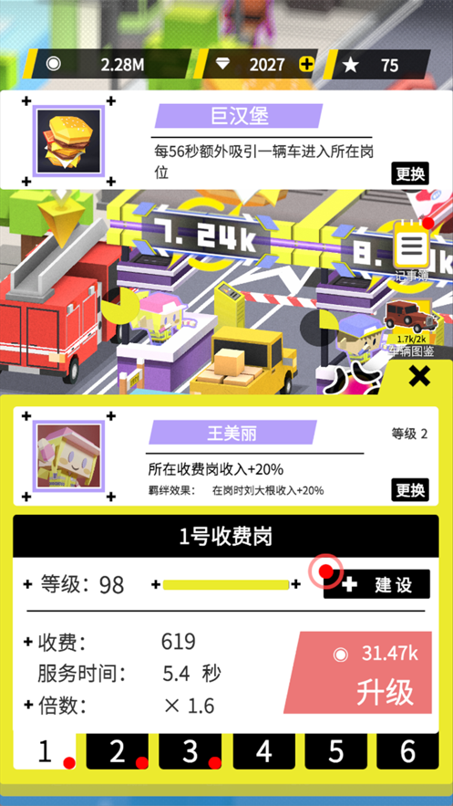 3、运营上没有什么难度,游戏的核心是通过不断建设收费站和升级设施来获取更多的利润。