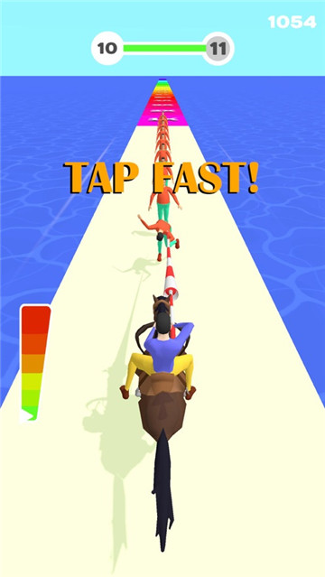 这是一场刺激的跑酷冒险,简单的操作,你只需要用武器将赛道上密密麻麻的人群全部赶下去,就能让提高马的速度,快速抵达终点