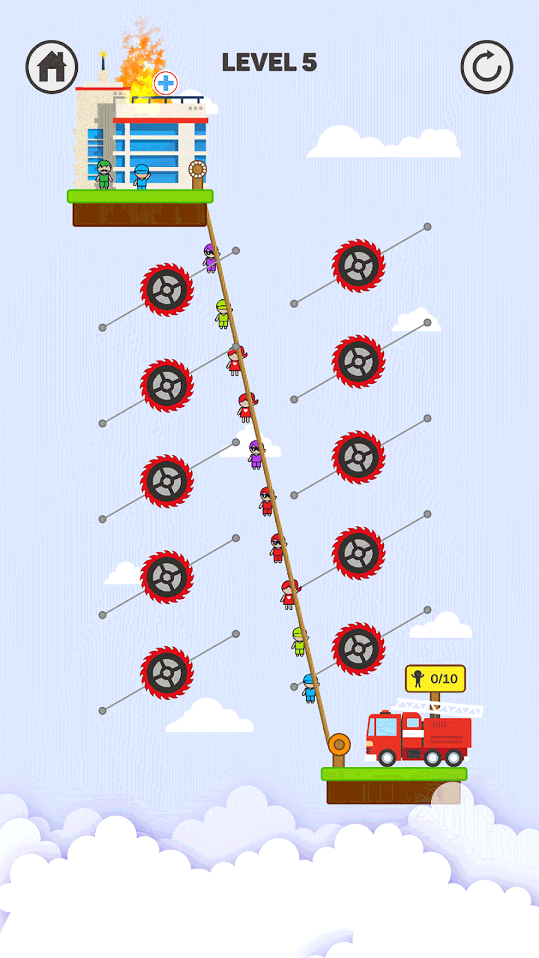 逆天救援游戏是一款十分好玩的手机烧脑闯关类的游戏,玩家们在这里需要快速的去进行拯救被困的人类,每一个关卡中的难度都是不同,在拯救的时候十分考验玩家们的智慧力哦,你可以利用绳索的功能快速的去将他们拯救出来,在这里游戏完成闯关的话还可以去获得丰富的游戏奖励呢,喜欢的话就来下载进行挑战吧。