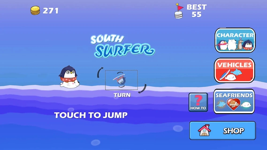 1、和小企鹅一起享受冲浪的乐趣,还有其他的动物伙伴作为可解锁的角色。