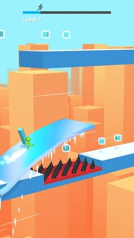 玩家需要躲避或冻结出现的障碍物,并不断的前进,到达终点解锁更多关卡的挑战;