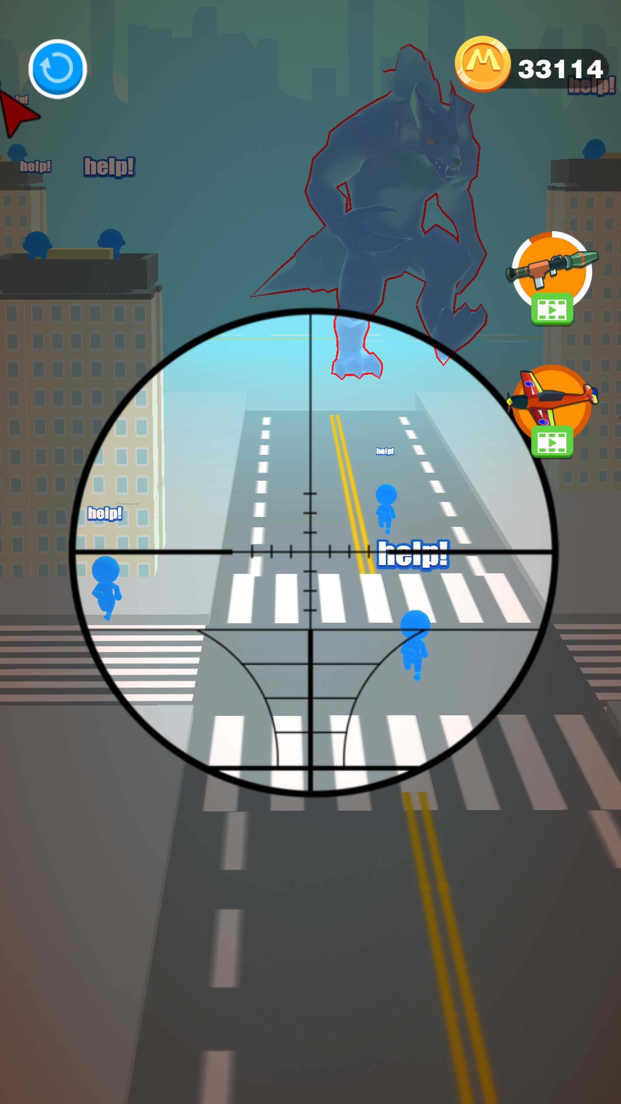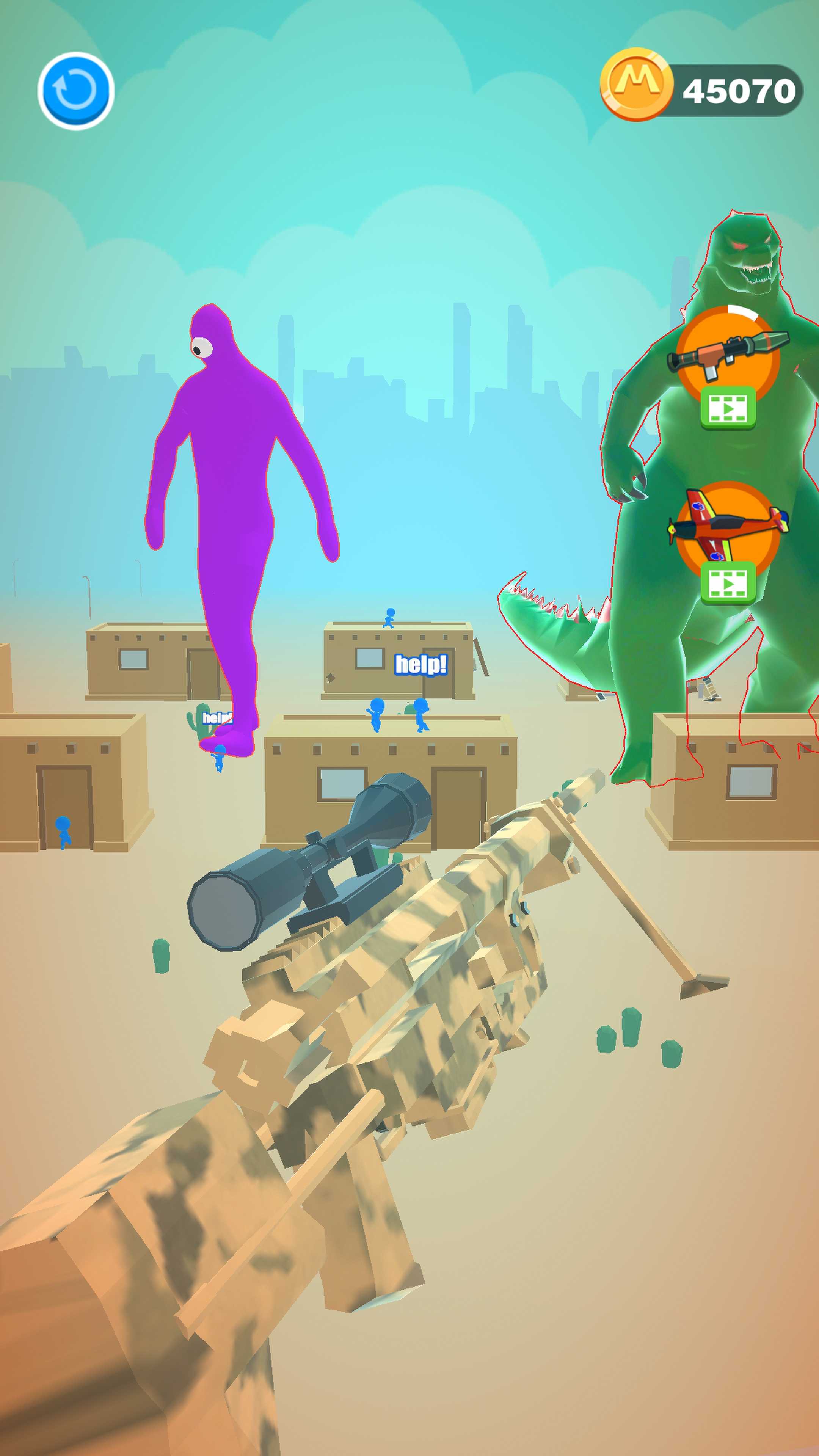 面对前方的巨型入侵者,你作为枪手,拿起你的武器,保卫你的家园!滑动瞄准,松手射击,轻松射杀敌人。