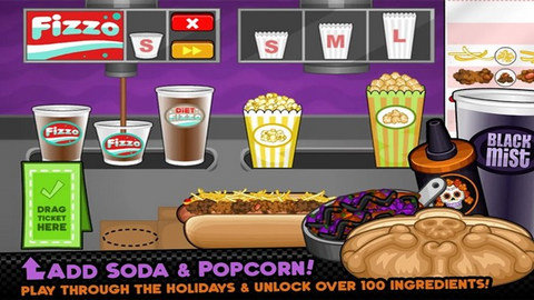1、玩家试图出售美味的热狗,赚钱扩大商店和解锁饮料,爆米花和其他商品。