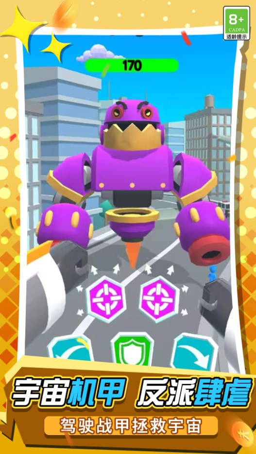 3、灵活操控巨大的机器人,去参与战斗,赶走危险的太空入侵者。