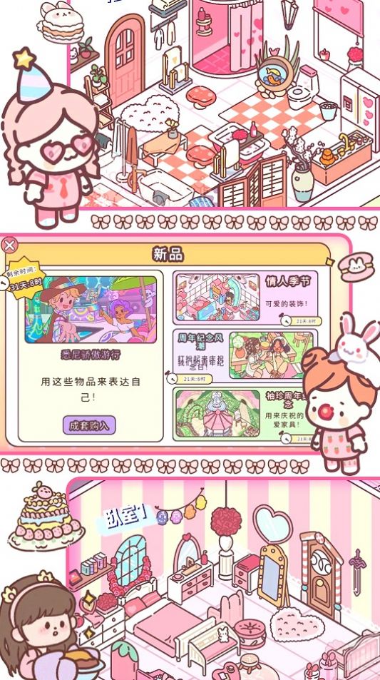 1、拥有非常少女心的画风,能够体验一段浪漫的恋爱生活,还能够解锁各种装扮来装修房屋;