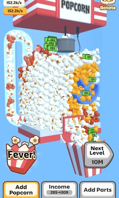 3、不断点击屏幕以生产爆米花。每次点击都会产生一定数量的爆米花,而生产速度会随着设备升级而增加。