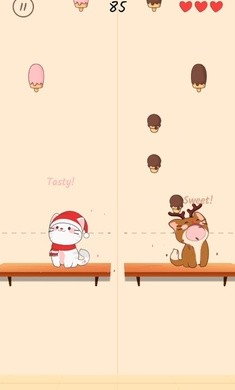 2、游戏中,玩家需要点击屏幕让两只猫咪吃到事食物,食物是不可以掉落的;