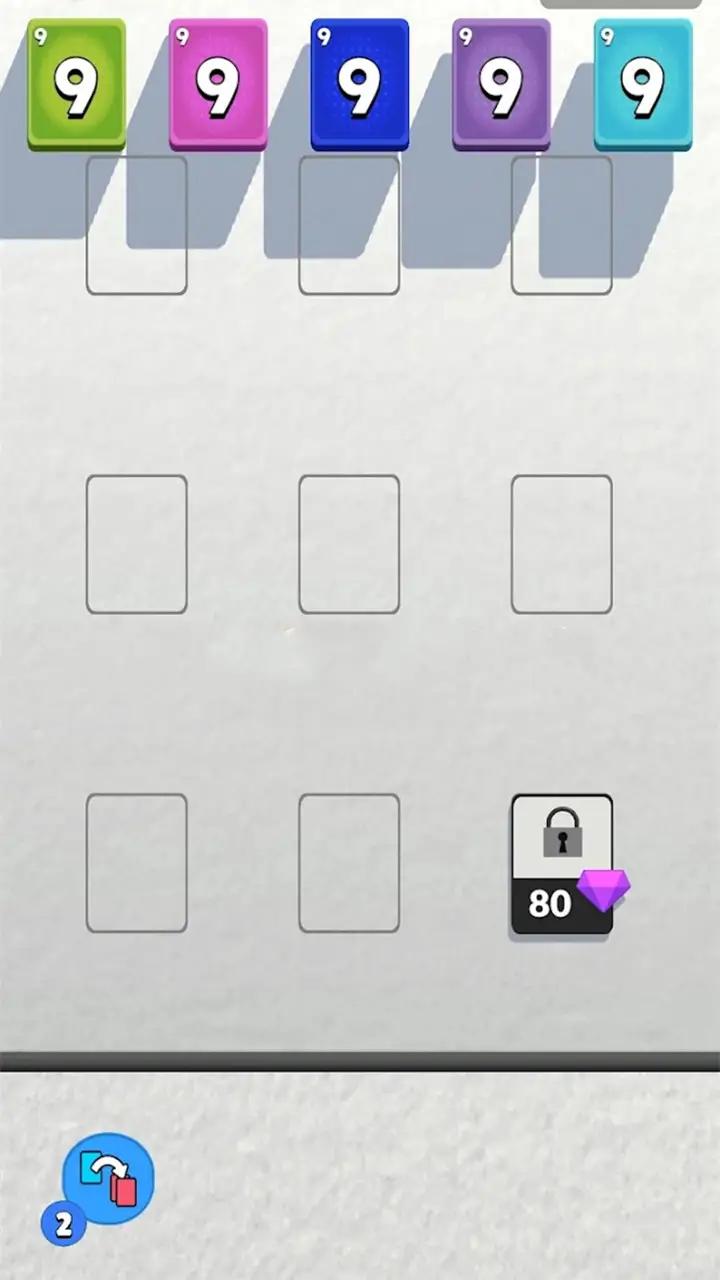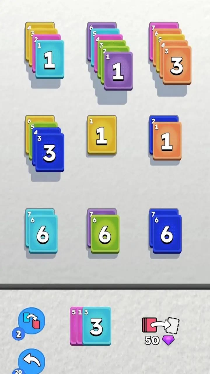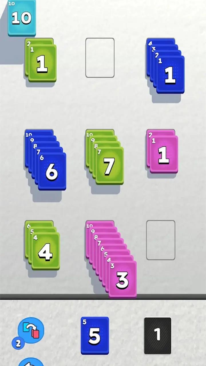 2、在这款游戏中,玩家需要尝试将相同颜色的卡片都堆积到一起。