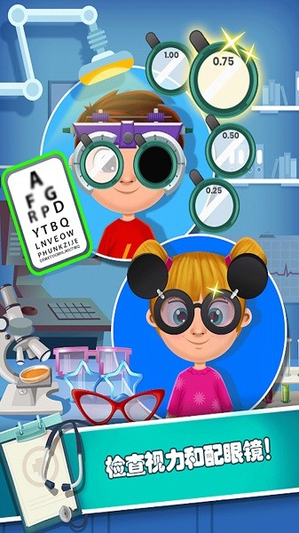 2、在小小诊所医生手游里,你要为近视的病人检查视力并为他推荐搭配一款时尚很酷的眼镜。