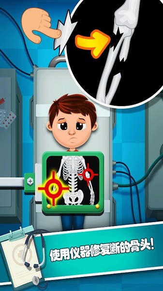 3、小小诊所医生手游中有个调皮的小朋友不小心把自己的骨头弄骨折了,赶紧用仪器为他固定并修复骨头!