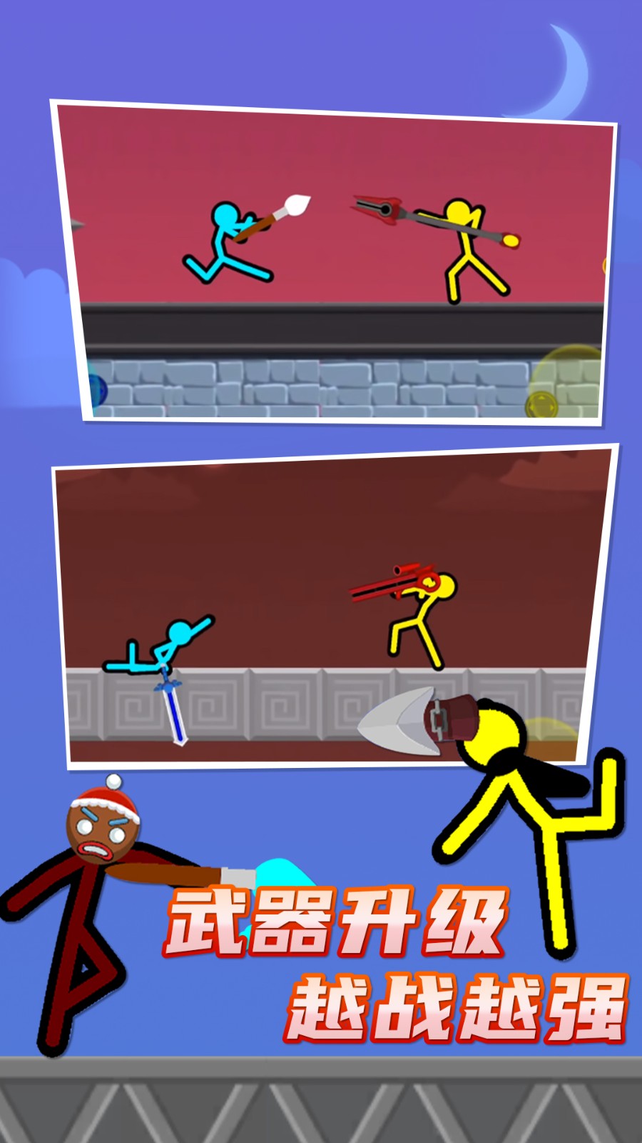 1、为了增加出招的多样性和游戏的可玩性,游戏中还加入了各种道具系统,比如可以为自己的火柴人装备武器或防具,这些道具可以帮助你在战斗中更加轻松地获胜。