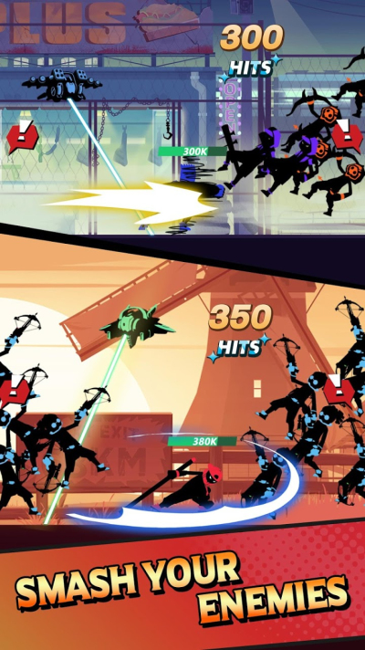 2、趣味搞笑的火柴人形象,炫酷华丽的攻击特效,闯关时控制火柴人躲避对方射击,运用手中的镖和剑与敌人一决生死。