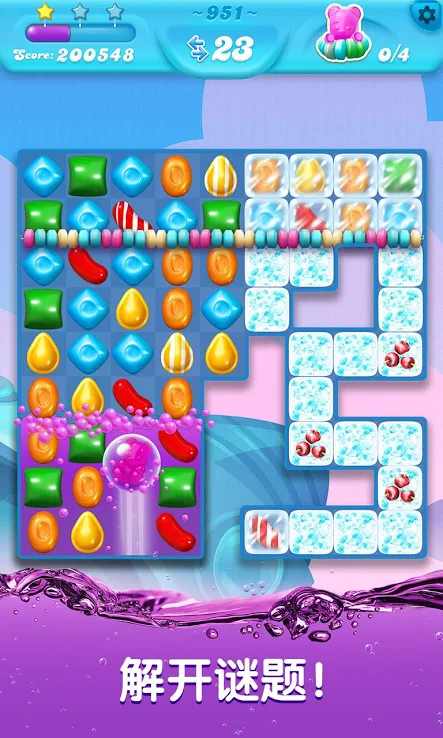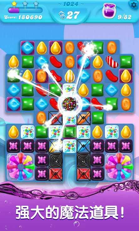 我们可以看到游戏中加入了一个特殊的紫色汽水模块,使得糖果不会在稍后掉落而是漂浮在屏幕上。