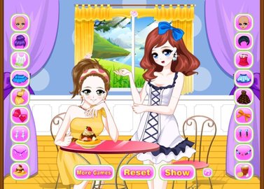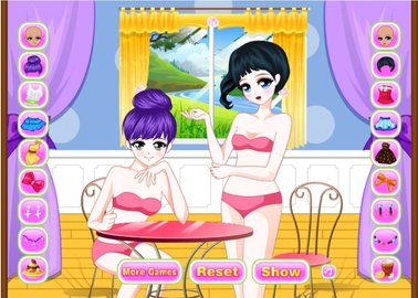 2.玩家能够为模特挑选不同的脸型,也能够挑选不同的发型哦。同时为两个女孩换装打扮