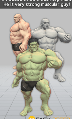 常规虚拟人体的8头身比例模特在漫画、游戏、插画等领域并不常用。easy poser提供了实用性更强的6头身(多种体型)男、女人体模特。[3头身q版人体模特准备中。]