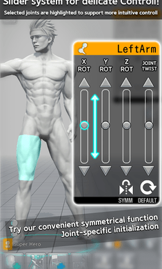 easy poser模特所有关节都可以方便快捷地手动调节。选中的操作部分支持局部放大、局部复位、左右翻转或对称等超越一般虚拟人体游戏的强大功能!请您尽情体验远超鼠标操作的畅快感吧!