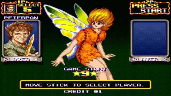 游戏中共有五个角色可选:老大彼得潘--PETerpAN、老二双刀--RUFIO、老三企鹅小子--ACE、老四娃娃--POCKETS、老五胖子--THUDBUTT。其中数老大、老四、老五较为厉害一些,另两个攻击力太差,单打通关不易,而用其它三人均可轻易通关。