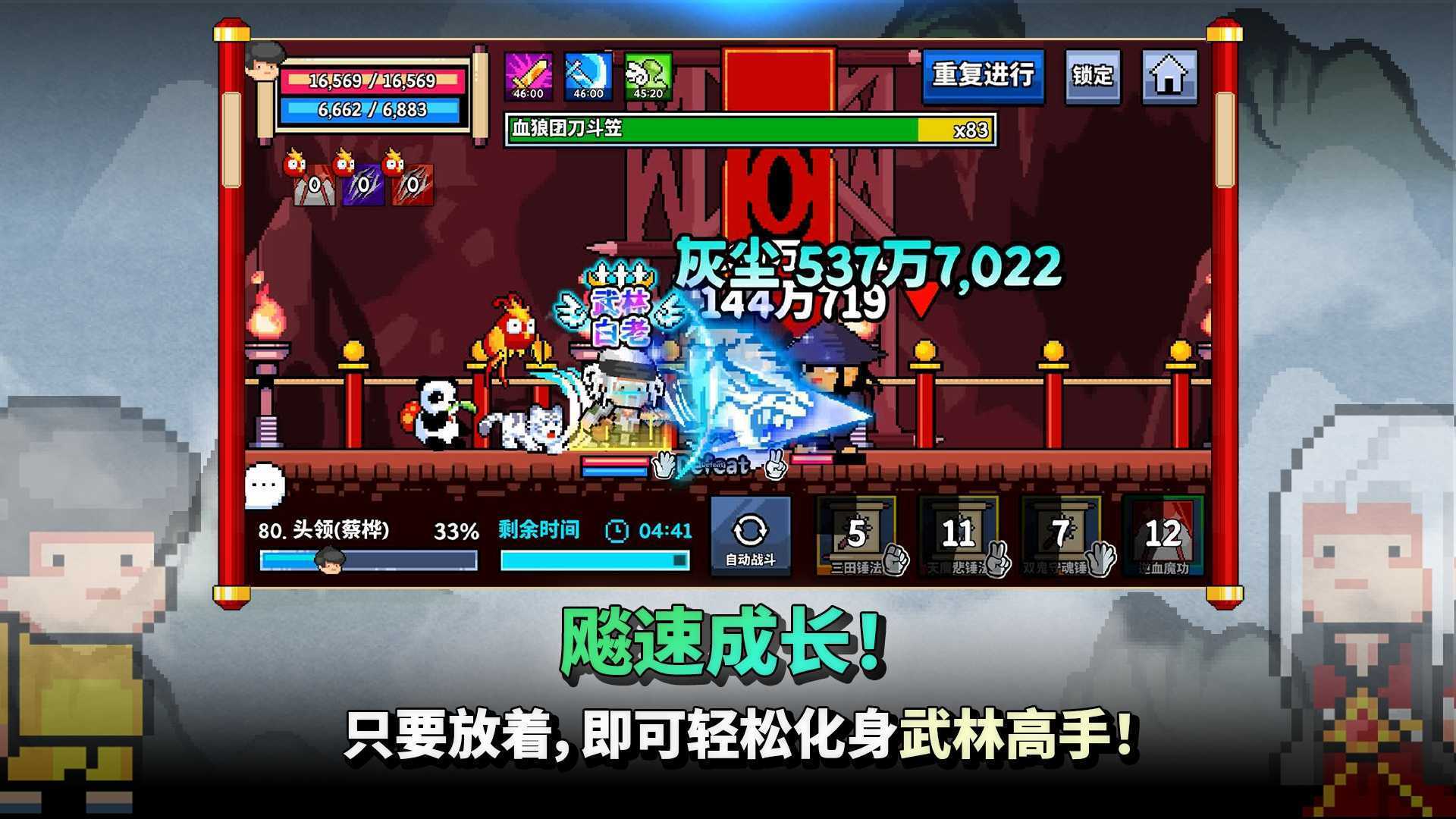 无限升级,挂机放置,解放双手,不再疲劳,轻松放置成武林大师。