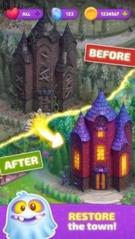 1、合并物品并翻新城镇,使其前所未有,您与之互动的可爱的幽灵生物。
